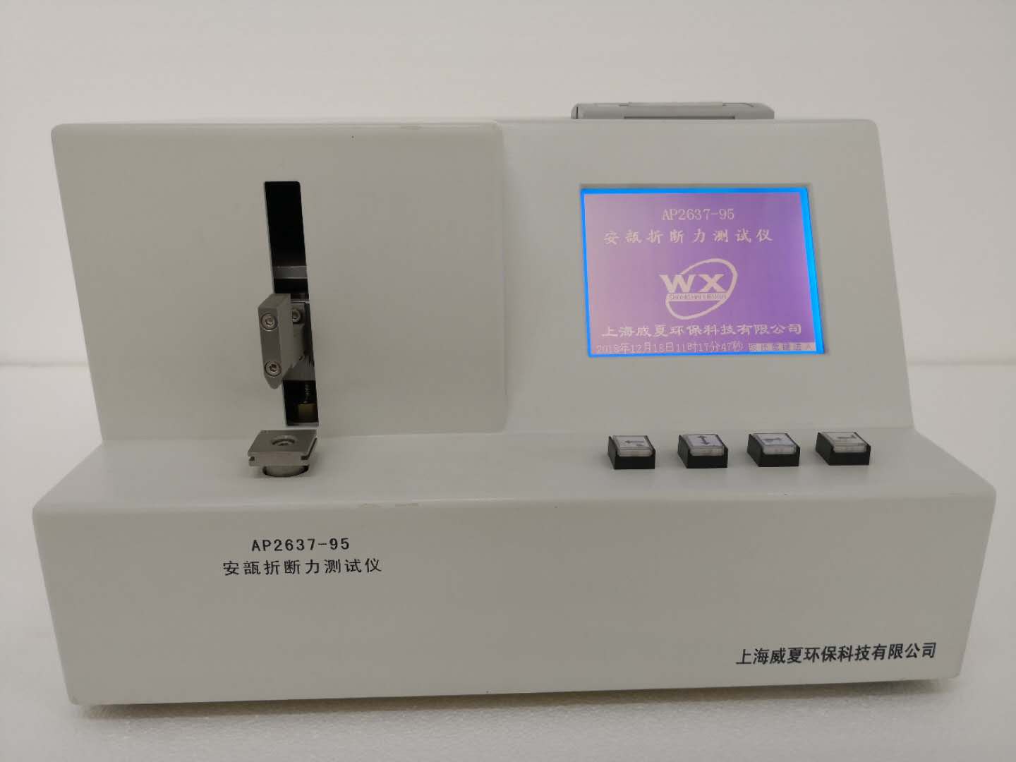 儀器采用6英寸(120X90)單彩液晶顯示屏,中文菜單顯示,用鍵盤控製液晶顯示屏上的菜單選擇規格、標準支架、上行、下行、時間、標定、測試次數、實時顯示折斷力及折斷力曲線,並可有機載打印機打印。